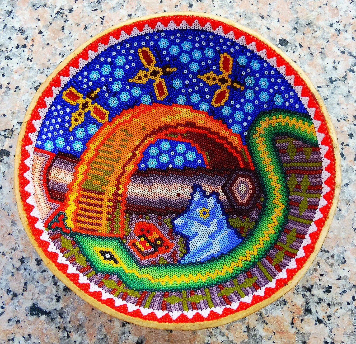Materiales Necesarios 1. Calabaza seca. 2. Cuentas de vidrio de colores. 3. Adhesivo natural. 4. Agujas y palillos para colocar las chaquiras. Dato Interesante: cada pieza es única, ya que los artesanos a menudo entran en un estado meditativo mientras trabajan, permitiendo que su creatividad fluya y que los diseños se desarrollen de manera intuitiva.